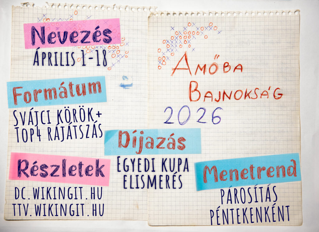 - Eredmények, párosítás: a https://dc.wikingit.hu szerver amoba-bajnoksag szobájában illetve élőben péntek este a https://www.twitch.tv/wikingit csatornán