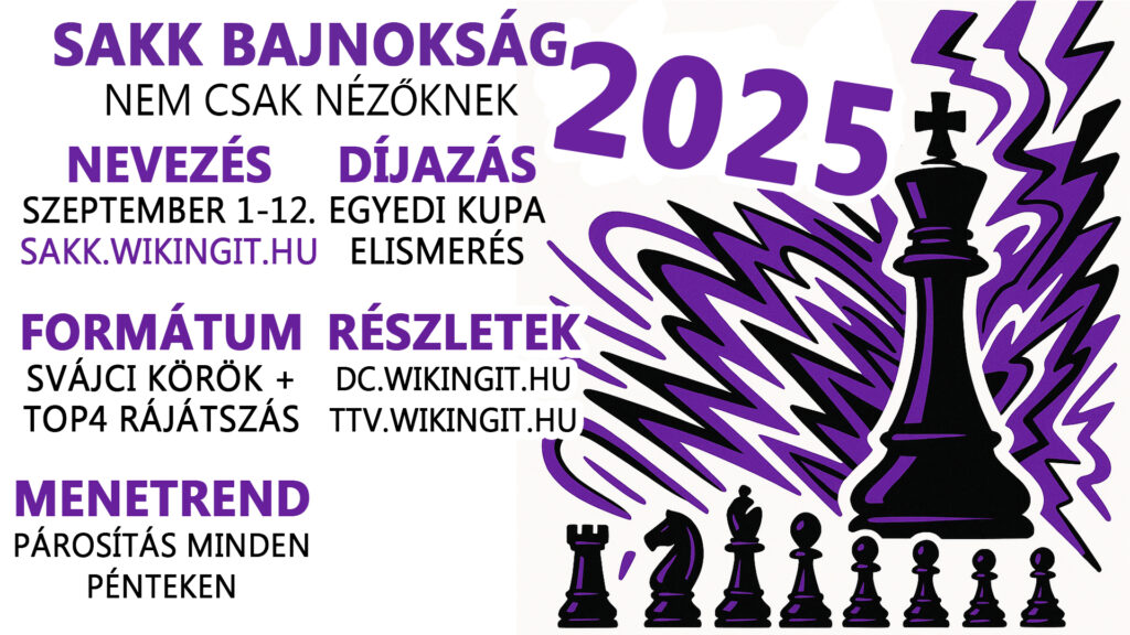 - Eredmények, párosítás: a https://dc.wikingit.hu szerver sakk-bajnoksag szobájában illetve élőben péntek este a https://www.twitch.tv/wikingit csatornán